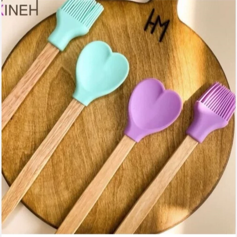 فرچه و لیسک سیلیکونی دسته چوبی بامبو اوستایل کفگیر سیلیکونی قلبی لیسک قلبی قلم روغن سیلیکونی