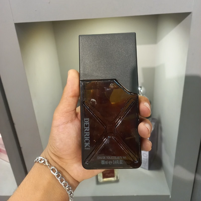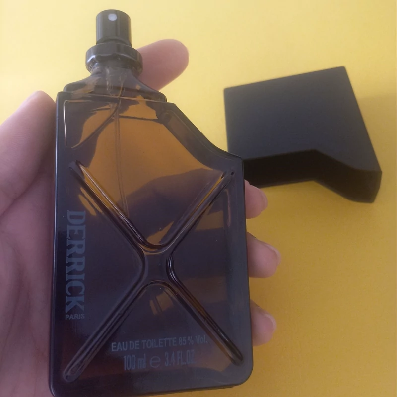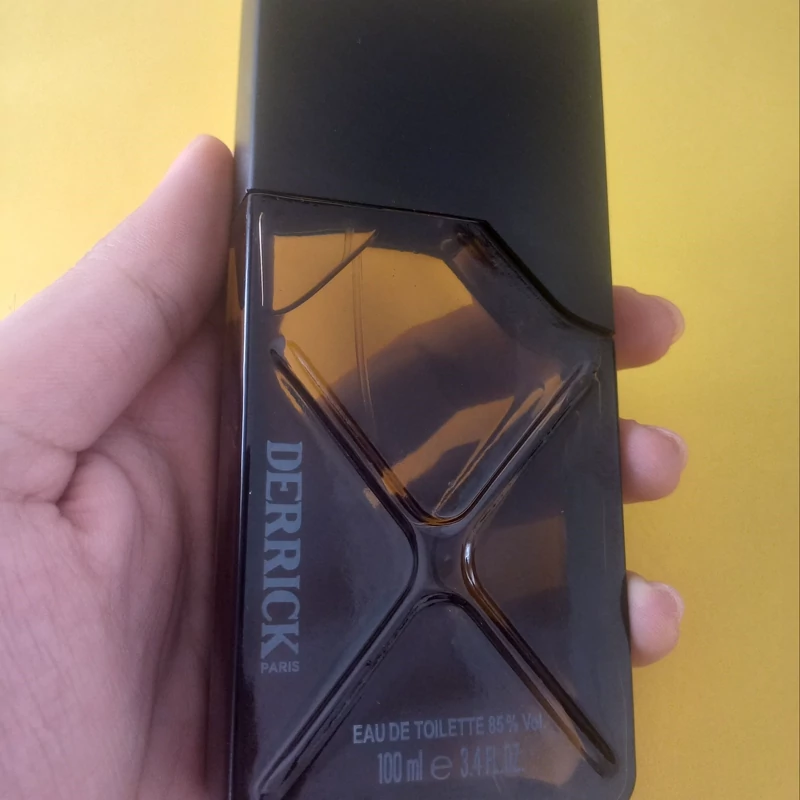 اگر به بطری این عطر تند و تیز نگاه دقیقی بیندازید، متوجه طراحی مردانه و محکم آن خواهید شد. روی شیشه، دو خط مورب به شکل ضربدری حک شده است که جدیت و استحکام Derrick را نشان میدهد. مایع طلاییرنگ درون بطری از روی شیشهی تیره و دودی آن به خوبی دیده میشود