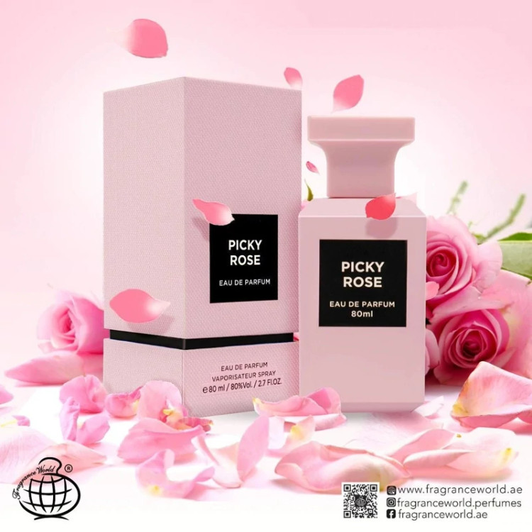 عطر ادکلن تام فورد رز پریک فرگرنس ورد (Fragrance World Picky Rose) عطری است معتدل ، کمی گرم و گلی برای زنان و مردان. عطر رز پریک در سال 2020 به بازار عرضه شد.این محصول نمونه شرکتی ادکلن تامفورد رز پریک اورجینال Tom Ford Rose Prick می باشد.