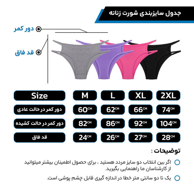 سازگار با پوست های حساس مقاوم در برابر شستشو دارای کمر کشی بسیار لطیف در بسته چهار عددی جنس محصول : 95% نخ پنبه ، 5% لاکرا رنگ های مشکی، ملانژ، بنفش، صورتی