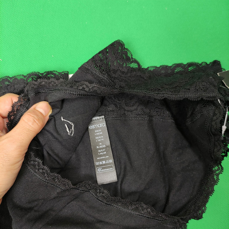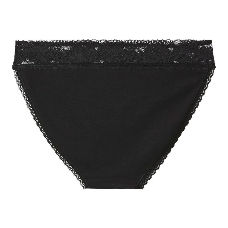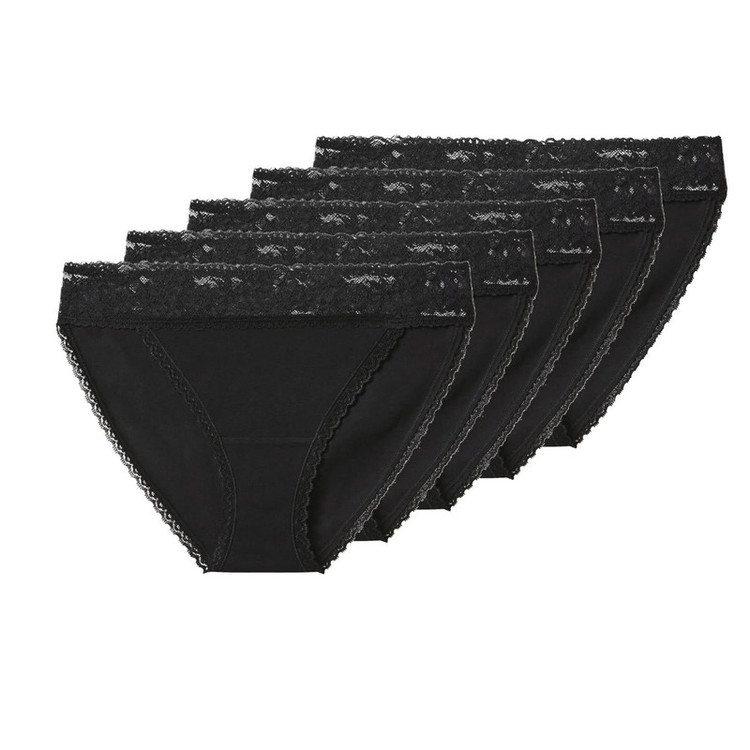 _ جنس: ترکیب نخ (پنبه)، الاستین و گیپور (برای تزئین)، ضد حساسیت و تنفسپذیر _ رنگ: مشکی _ طرح: ساده، با گیپور دوزی پهن در لبه کمر و لبههای دالبری ظریف _ مناسب فصل: تمام فصول (استفاده روزانه)