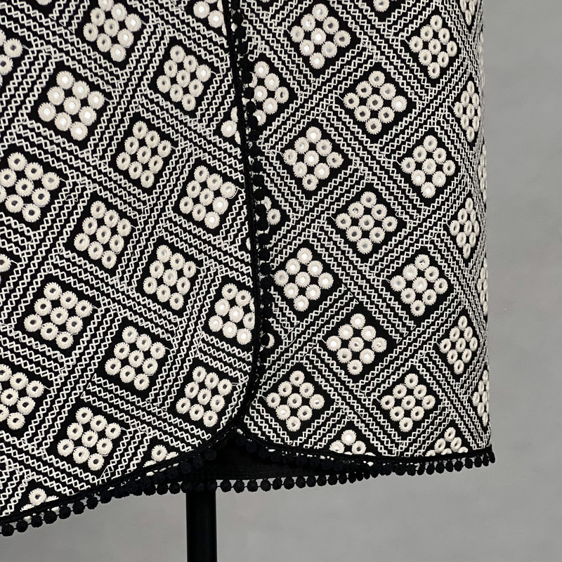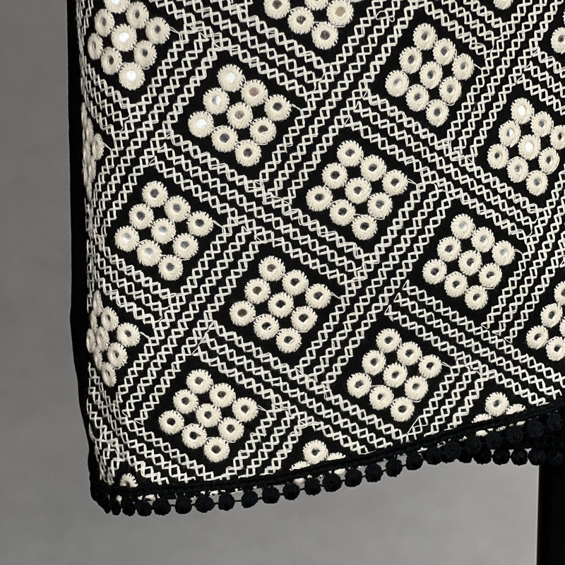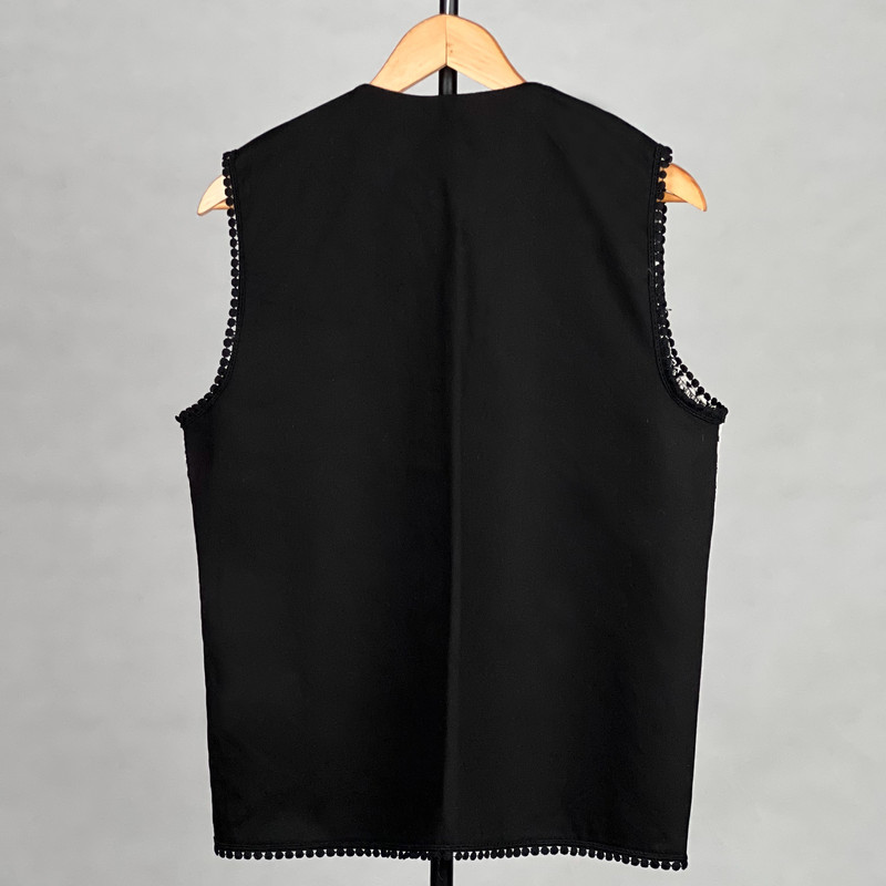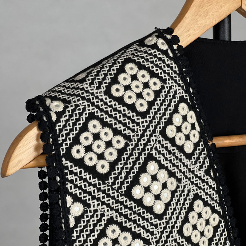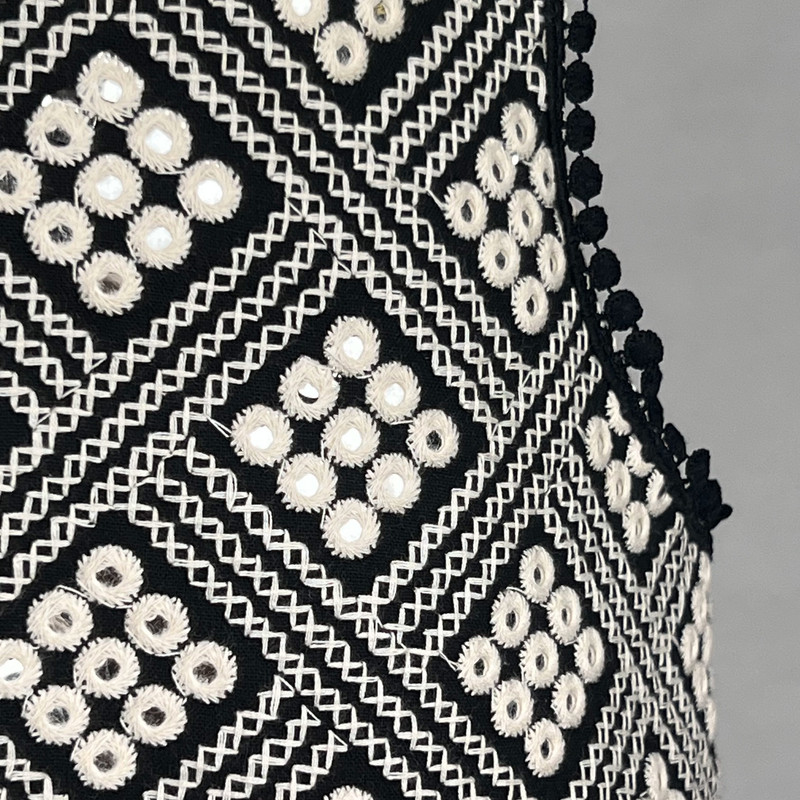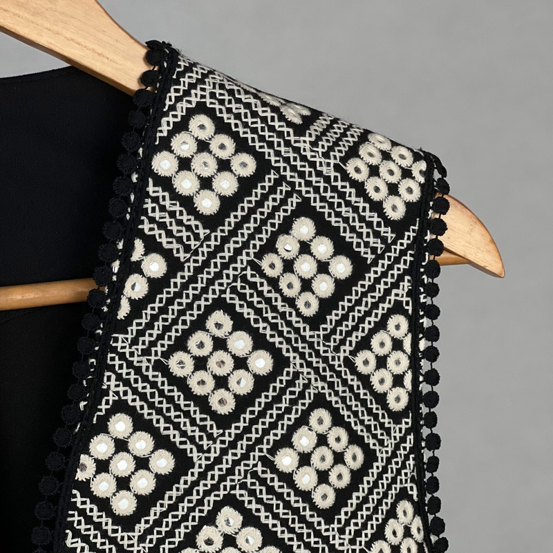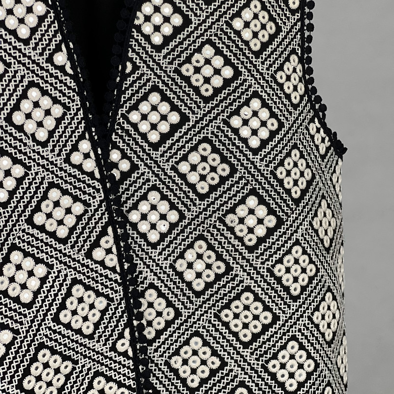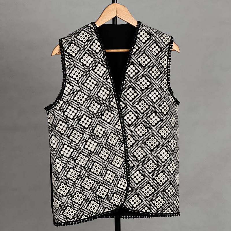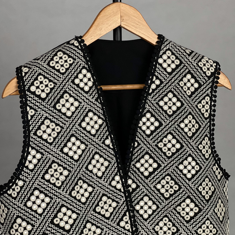 این وست نمادی از اصالت و شکوه سنتی است که با کنتراست چشمگیر سیاه و سفید، هر نگاهی را به خود جلب میکند. این وست با قد ۶۵ سانتیمتر دوخته شده و دارای پشت کتان برای راحتی و ایستایی مناسب است. هنر اصلی در نمای جلویی آن با آینهکاریهای ریز و درخشان متبلور شده است که در میان طرحهای متقاطع سیاه و سفید میدرخشند. لبههای یقه و پایین کار نیز با نواردوزی عدسی مشکی تزئین شدهاند تا جلوهای دقیق و پرکار به آن ببخشند. این وست، انتخابی جسورانه برای مجالس خاص و استایلهای تلفیقی سنتی-مدرن است.