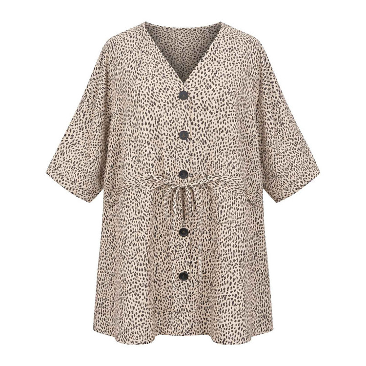 _ رنگ: پلنگی خالدار (قهوهای و مشکی) _ جنس: پلی استر درجه یک _ یقه: هفت (V-neck) _ قد: روی زانو _ نوع آستین: بلند (با برش آزاد)