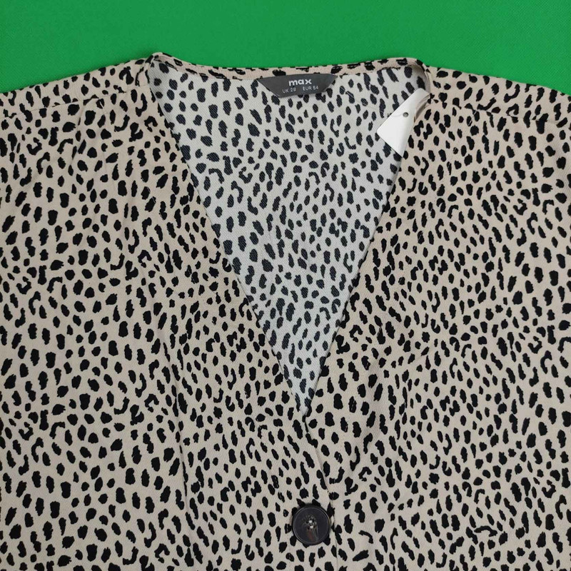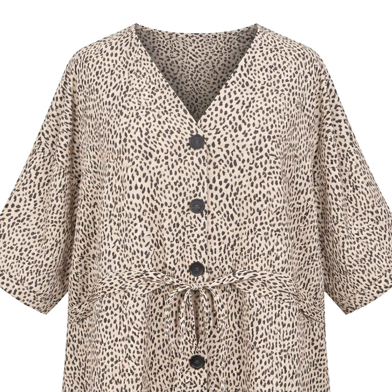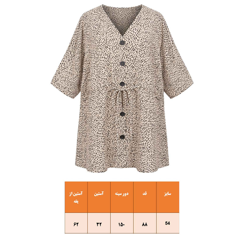 _ رنگ: پلنگی خالدار (قهوهای و مشکی) _ جنس: پلی استر درجه یک _ یقه: هفت (V-neck) _ قد: روی زانو _ نوع آستین: بلند (با برش آزاد)