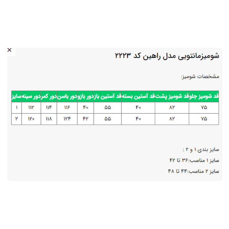 طرحسادهقدروی باسنمدل یقهایستادهنوع آستینآستین بلندتنخور لباسمعمولی (regular fit)مورد استفادهروزمرهجنسنخ
