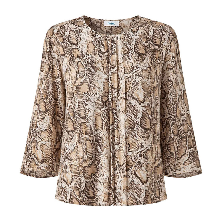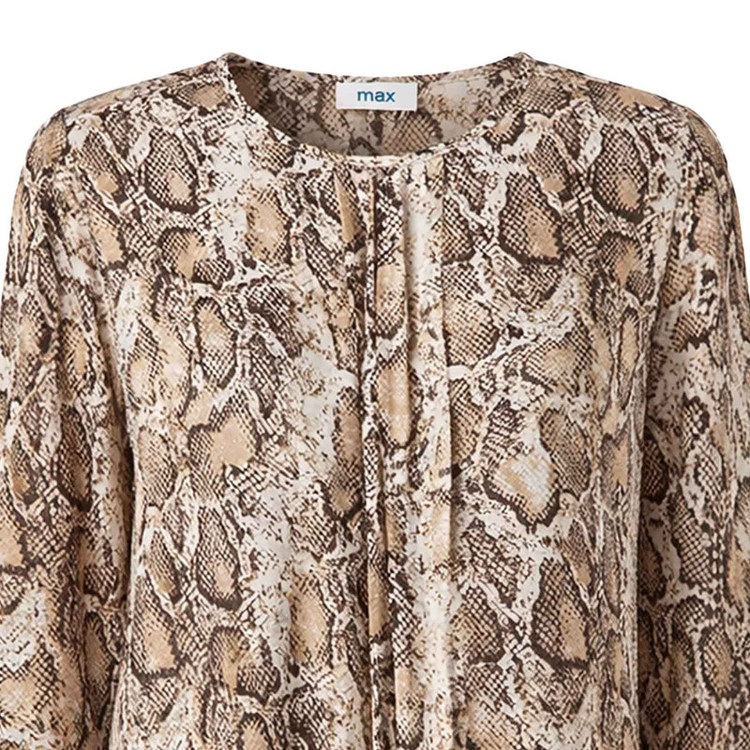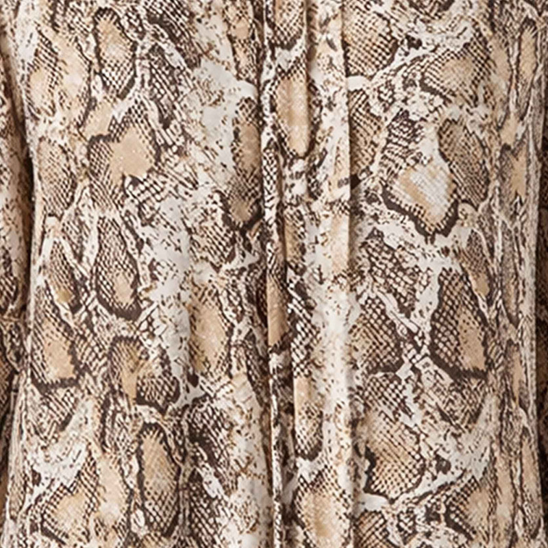 _ رنگ: قهوهای پوست ماری _ جنس: کرپ درجه یک (ریزشدار و لطیف) _ یقه: گرد با جزئیات تزئینی در جلو _ نوع آستین: بلند شیپوری (کلوش) _ قد لباس: روی باسن