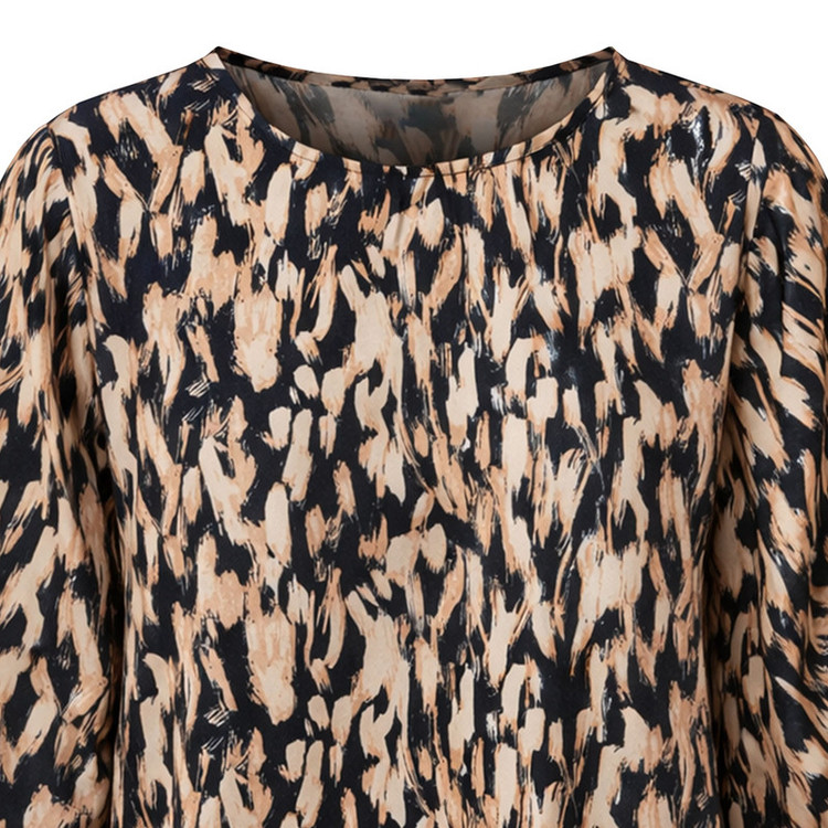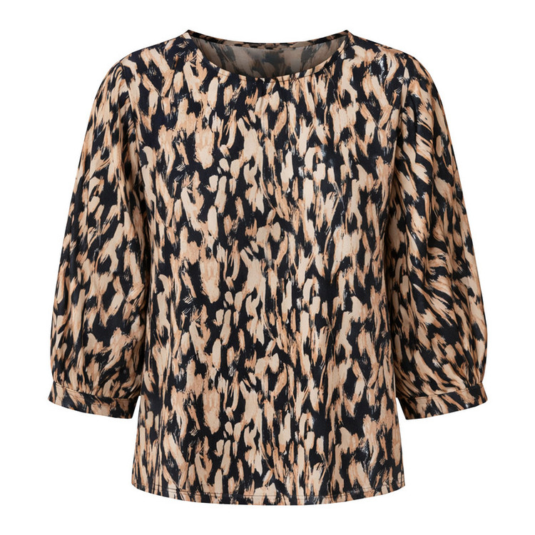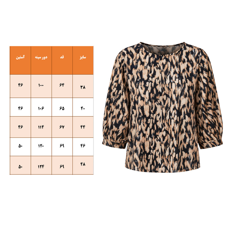 _ جنس: الیاف نرم و سبک _ قد: روی باسن _ تنخور: معمولی (Regular Fit) _ نوع آستین: سه ربع با لبه پاکتی _ نوع یقه: گرد ساده