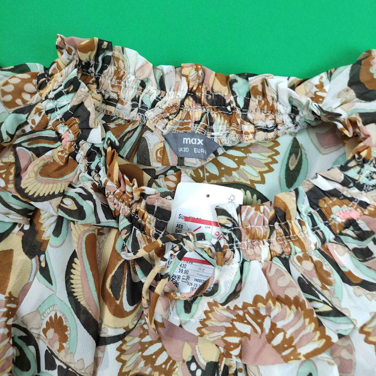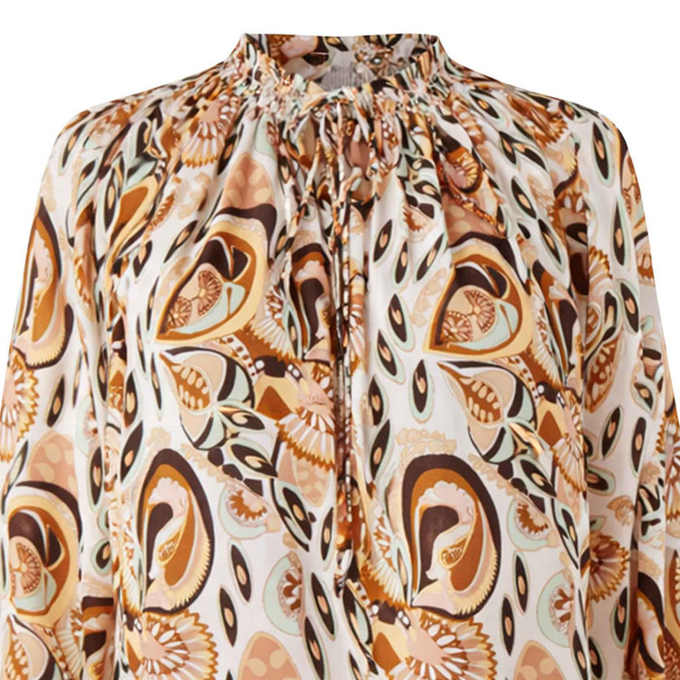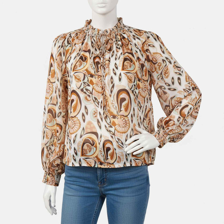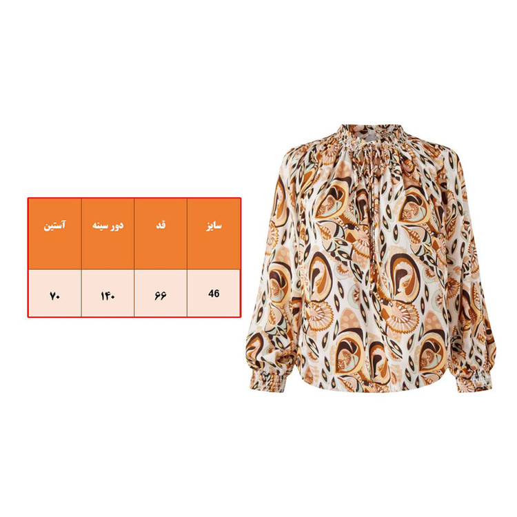 _ نوع یقه: ایستاده (High Neck) با جزئیات چیندار _ جنس پارچه: حریر (Chiffon) - سبک و نیمهشفاف _ قد لباس: روی باسن _ نوع آستین: بلند