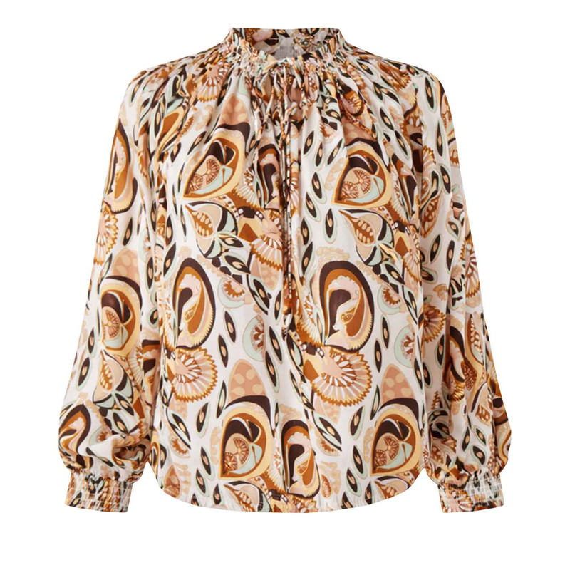 _ نوع یقه: ایستاده (High Neck) با جزئیات چیندار _ جنس پارچه: حریر (Chiffon) - سبک و نیمهشفاف _ قد لباس: روی باسن _ نوع آستین: بلند