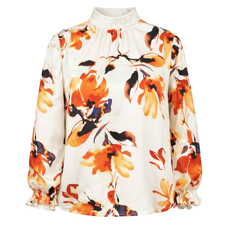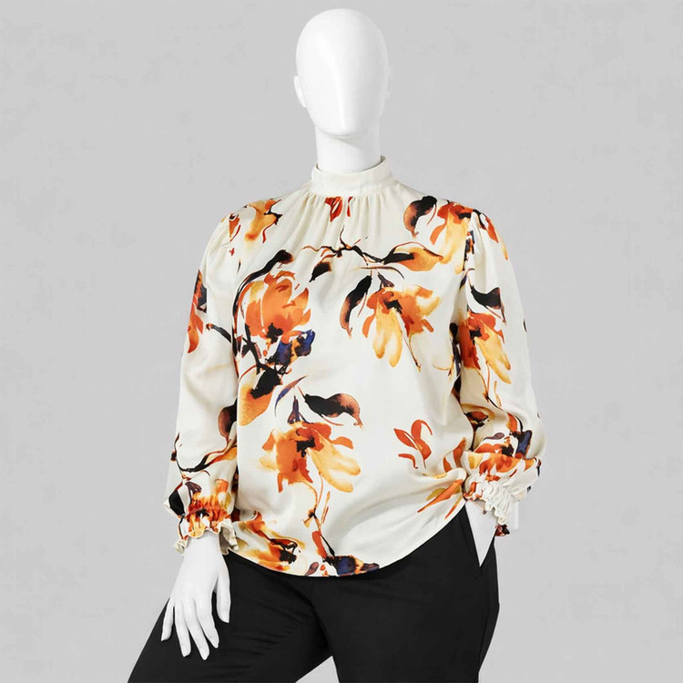 _ رنگ: سفید با طرح گلهای نارنجی _ نوع یقه: ایستاده (High Neck) _ جنس پارچه: ساتن درجه یک (براق و لطیف) _ قد لباس: روی باسن _ نوع آستین: بلند (با سرآستین کشباف ظریف) _ تنخور: معمولی (Standard Fit)