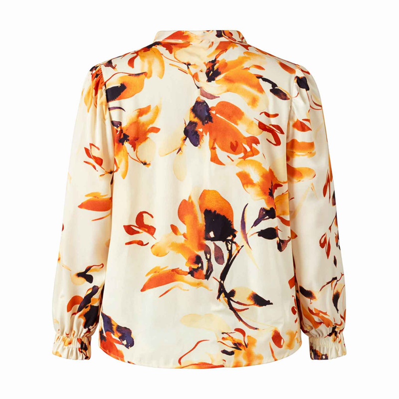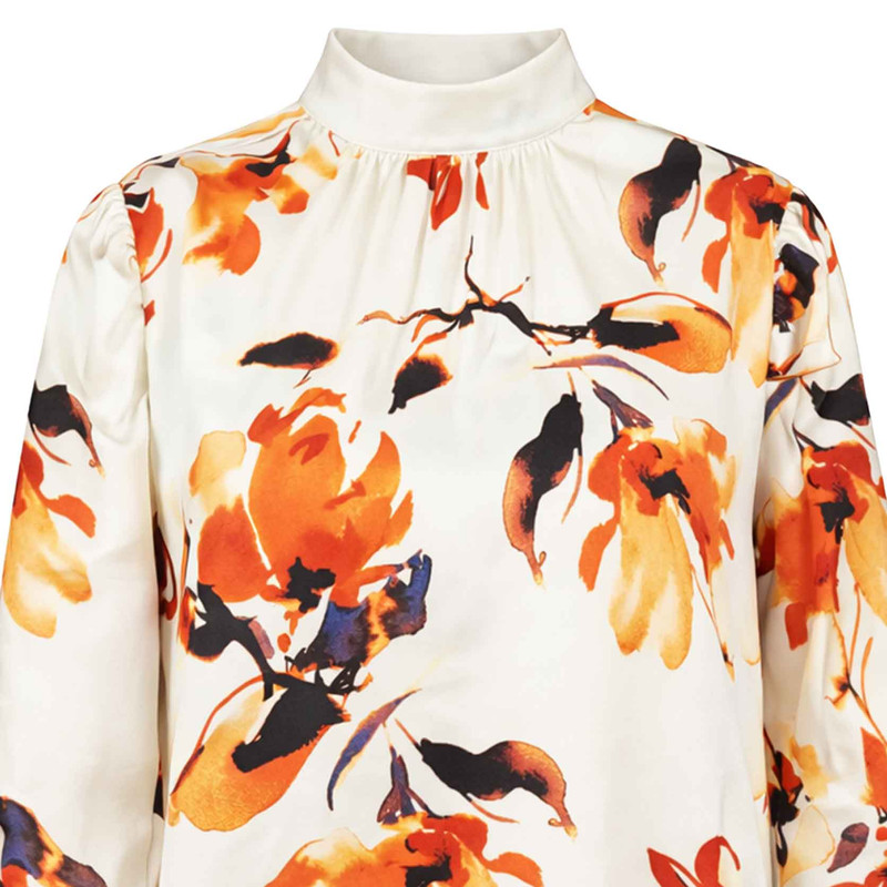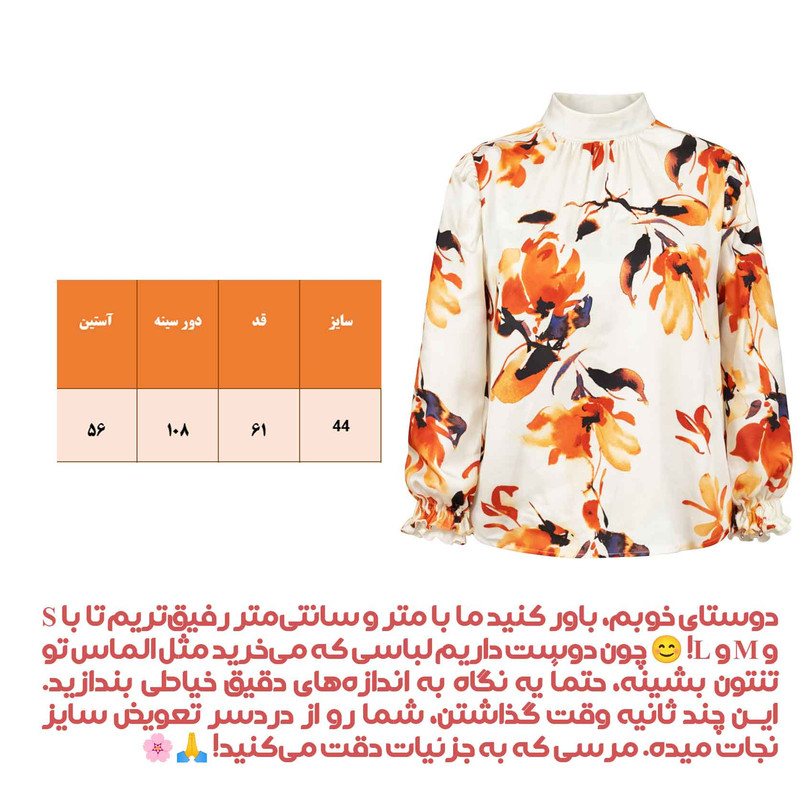 _ رنگ: سفید با طرح گلهای نارنجی _ نوع یقه: ایستاده (High Neck) _ جنس پارچه: ساتن درجه یک (براق و لطیف) _ قد لباس: روی باسن _ نوع آستین: بلند (با سرآستین کشباف ظریف) _ تنخور: معمولی (Standard Fit)
