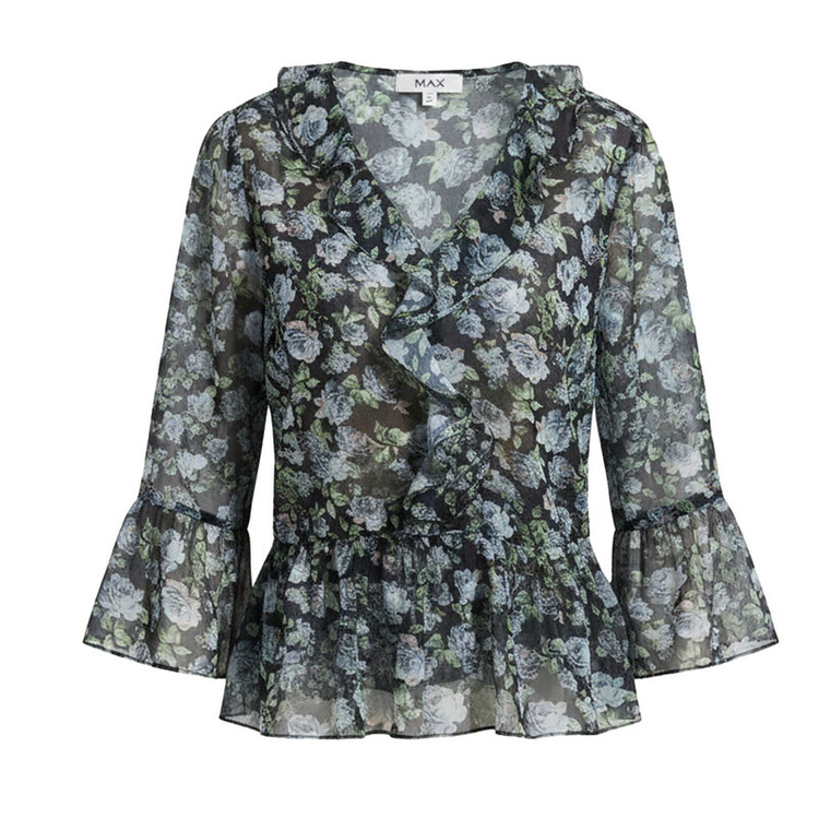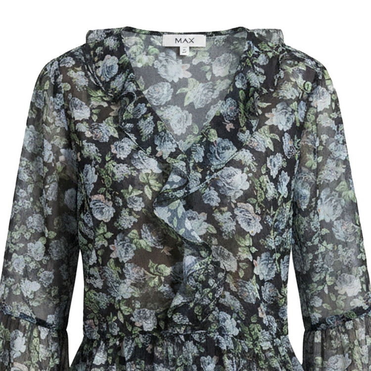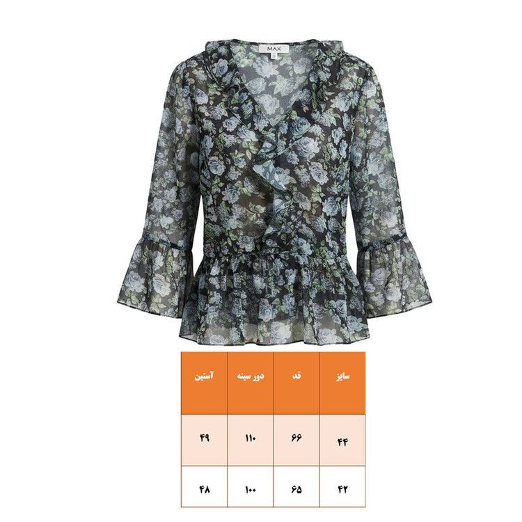 _ جنس: حریر لطیف با ترکیب تور ظریف _ قد: بالای باسن _ تنخور: معمولی (Standard Fit) _ یقه: هفت با تزئینات چیندار (Ruffle)