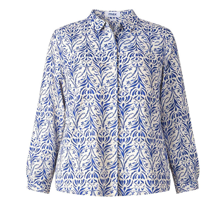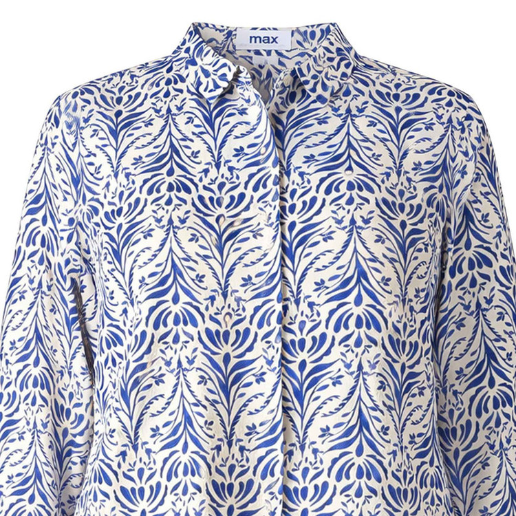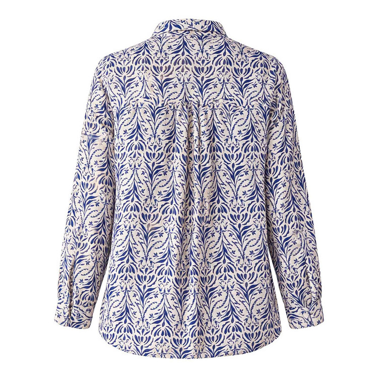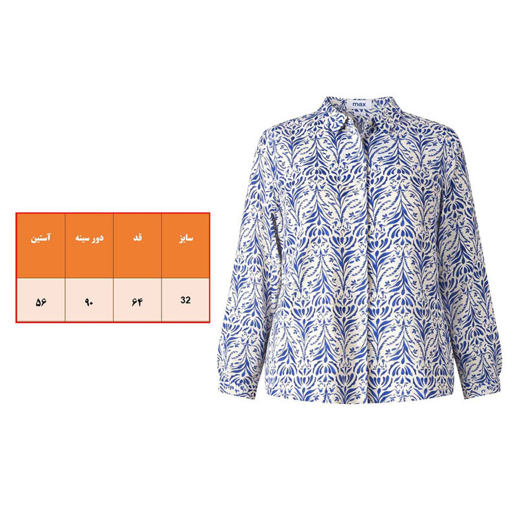 _ رنگ: کرمی با طرح گلهای آبی و سرمهای _ جنس: کرپ درجه یک (با ریزش عالی) _ نوع یقه: برگردان کلاسیک _ نوع آستین: بلند (مچدار) _ تنخور: معمولی (Standard Fit)