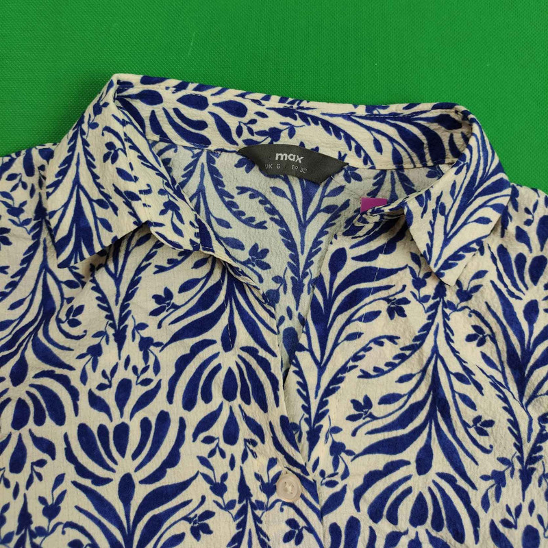 _ رنگ: کرمی با طرح گلهای آبی و سرمهای _ جنس: کرپ درجه یک (با ریزش عالی) _ نوع یقه: برگردان کلاسیک _ نوع آستین: بلند (مچدار) _ تنخور: معمولی (Standard Fit)