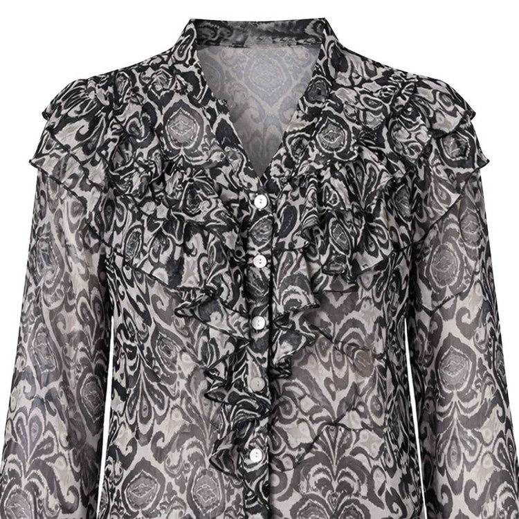 _ رنگ: سیاه و سفید (طرحدار اسلیمی/سنتی) _ جنس پارچه: حریر لطیف (Harir) _ نوع یقه: یقه هفت (V-Neck) با جزئیات چیندار _ نوع آستین: بلند (دارای مچ دکمهدار) _ قد لباس: روی باسن _ تنخور: معمولی (Standard Fit)
