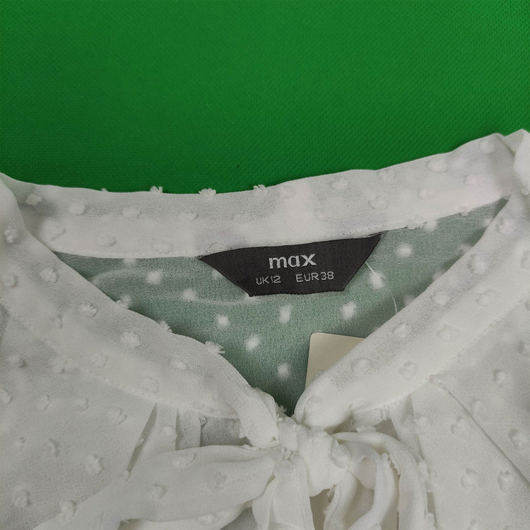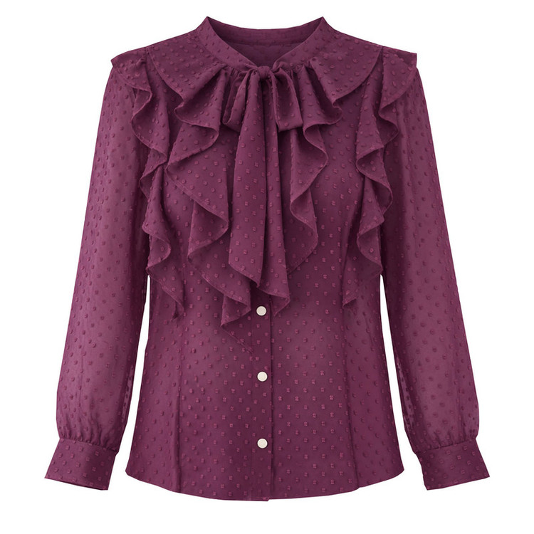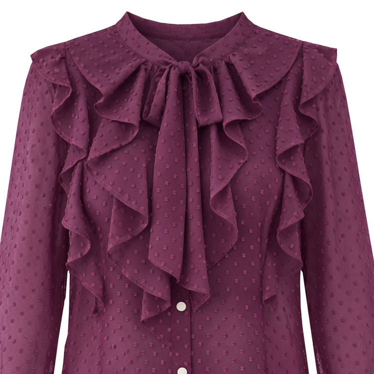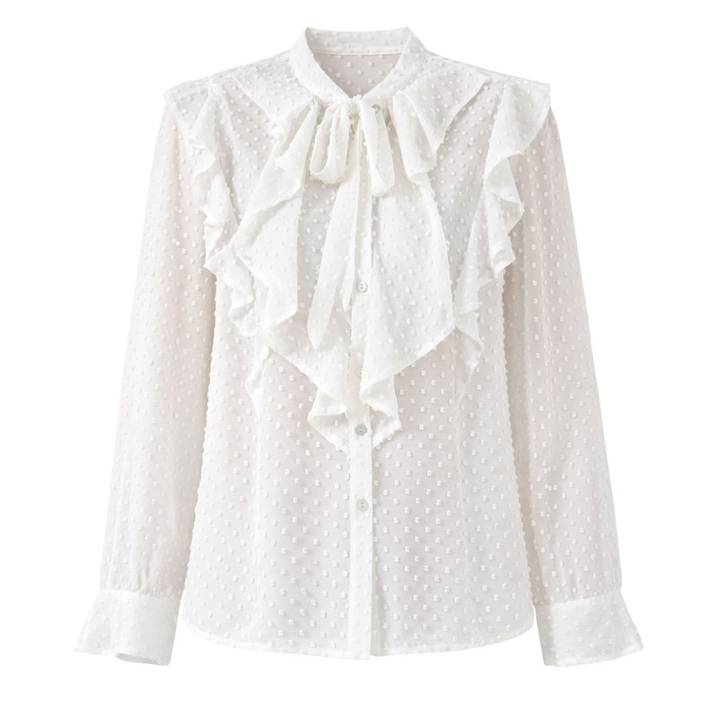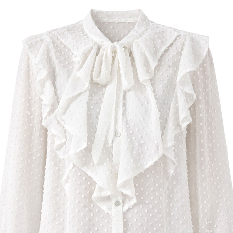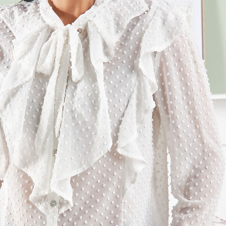 _ جنس: حریر شفاف با طرح خالدار برجسته (Swiss Dot) _ قد: روی باسن _ تنخور: معمولی (Regular Fit) _ نحوه بسته شدن: جلو دکمه با بند کراواتی یقه _ جزئیات طراحی: دارای لبههای چیندار (کلوش) در دو طرف دکمهها