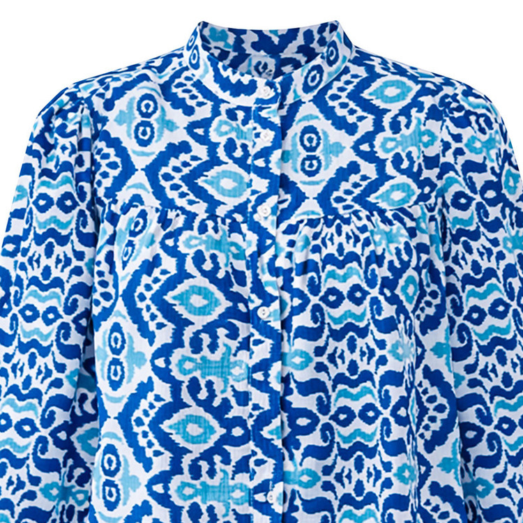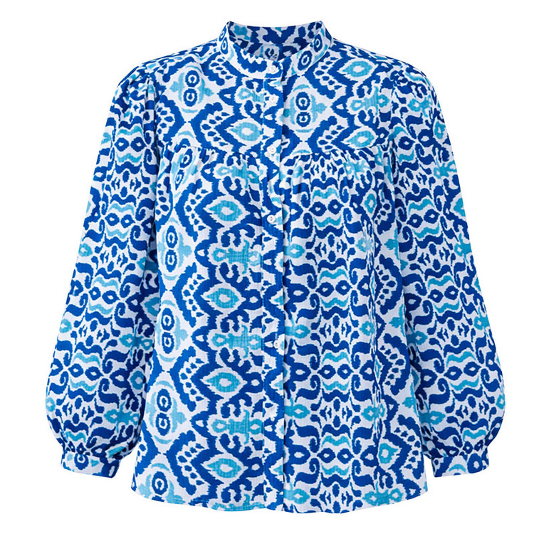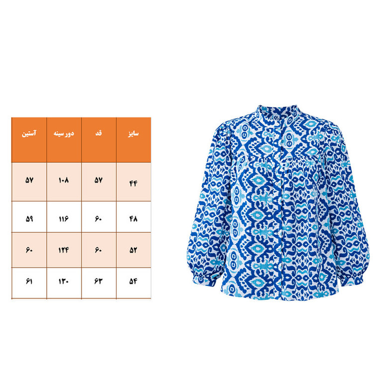 _ طرح: سنتی/اسلیمی (Ikat Pattern) _ قد: روی باسن _ تنخور: معمولی (Regular Fit) _ نوع یقه: ایستاده (باند) با لبه چیندار _ نوع آستین: بلند و پفی با مچ کشدار
