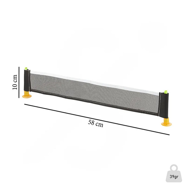 عدد راکت با ابعاد 14 در 9 سانتی متر _ 1عدد تور با ابعاد 57.5 در 7.5 سانتی متر _ 2 عدد پایه نگه دارنده تور _ 2عدد پستانک برای اتصال به سطح مورد نظر _ 1عدد توپ Jade