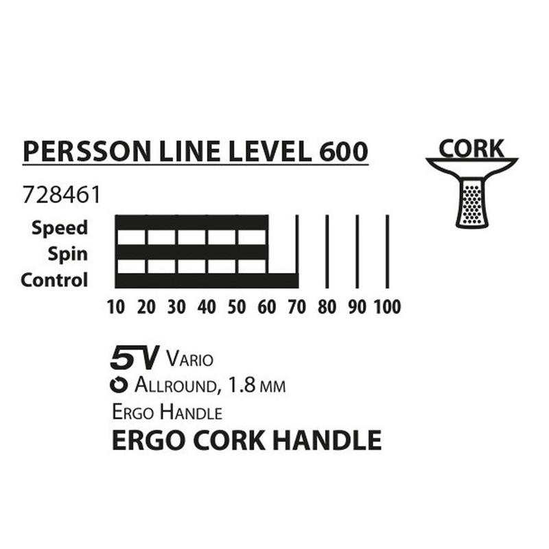 چوب: Vario (5V) دسته: مقعر لاستیک: نرم مخصوص دونیک مرکز گرد Ergo بین دسته چوب پنبه و لاستیک اسفنج: 1.8 میلی متر