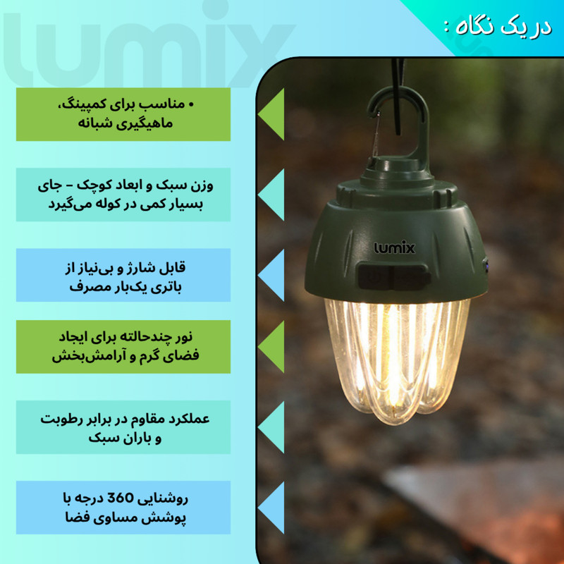 نوع تجهیزات جانبی سفر و کمپینگ: چراغ روشنایی , چراغ اضطراری , چراغ آویز چادر , چراغ شارژی , چراغ کمپینگ