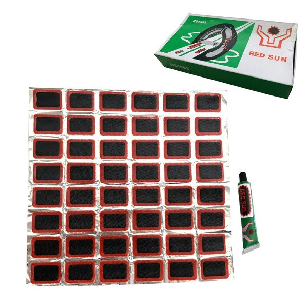 1 عدد چسب مخصوص - 48 عدد وصله همه اقلام درون یک جعبه میباشد قابل استفاده برای 48 بار پنچرگیری دوچرخه