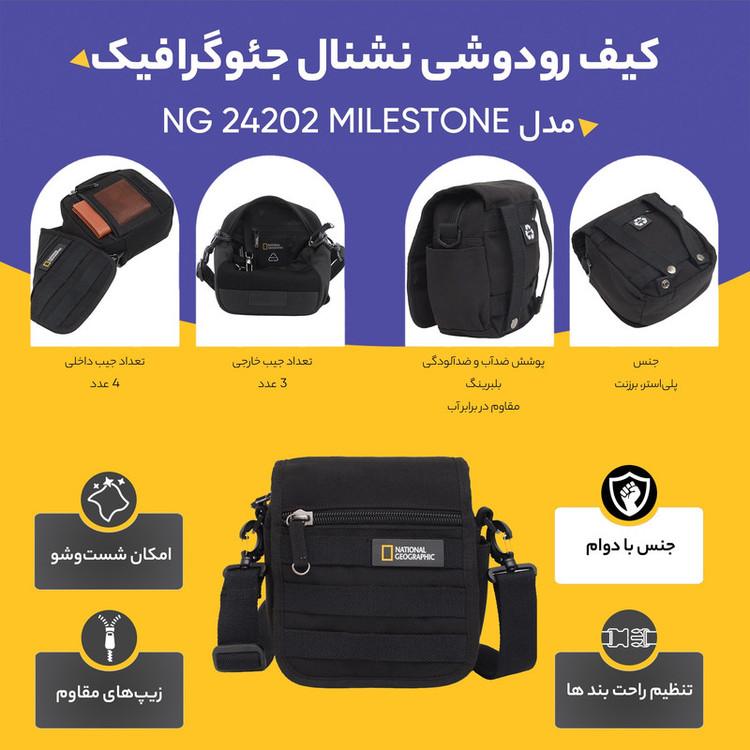 - ضد آب و قابل شست و شو - جنس آستر : پلی استر - دارای محفظه نگهداری موبایل - دارای محفظه نگهداری کارت های اعتباری - قابلیت استفاده به صورت کمری و رودوشی - دارای بند آویز کلید