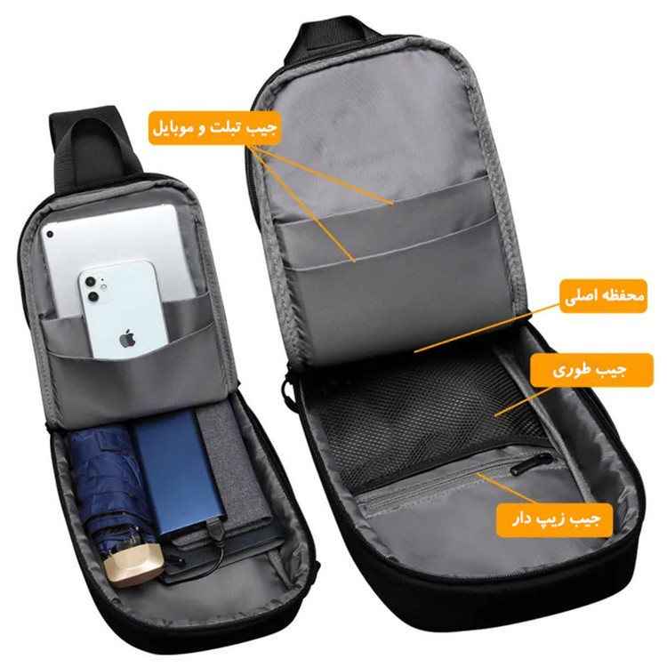 جیب بیرونی , جیب داخلی , دارای یک محفظه اصلی , محفظه نگهداری تبلت