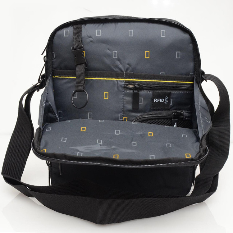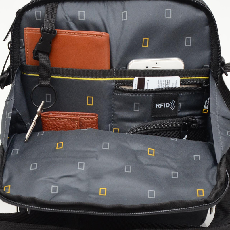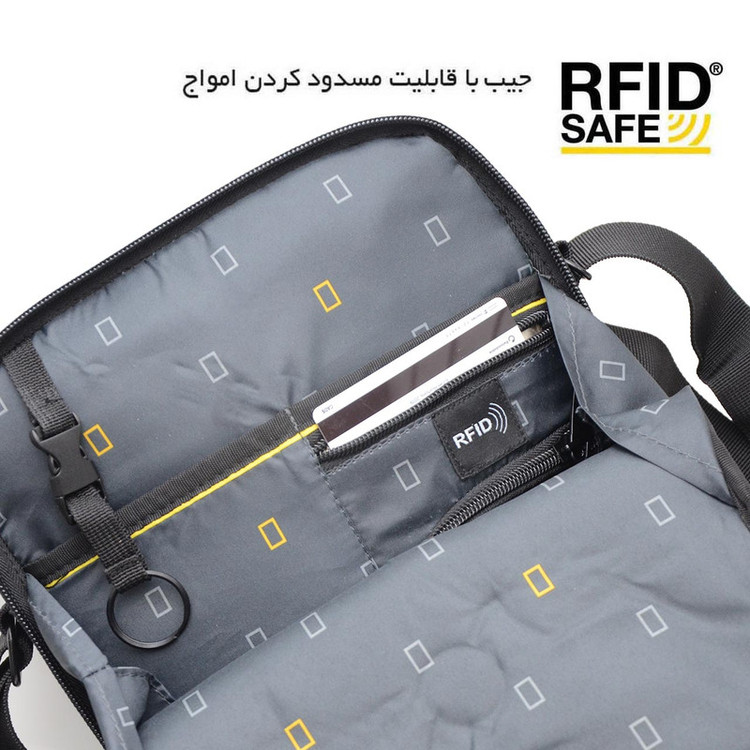 - ضد آب و قابل شست و شو - جنس آستر : پلی استر - دارای محفظه نگهداری کارت اعتباری - دارای محفظه نگهداری موبایل - دارای جیب با قابلیت مسدود کردن امواج ( RFID ) - دارای قلاب جهت آویز کلید