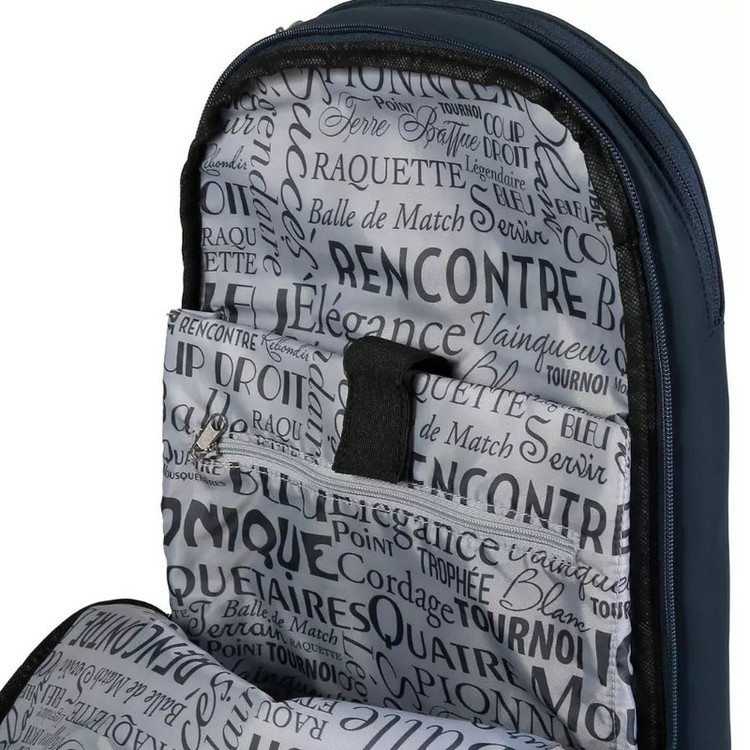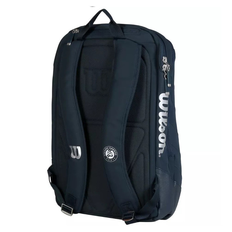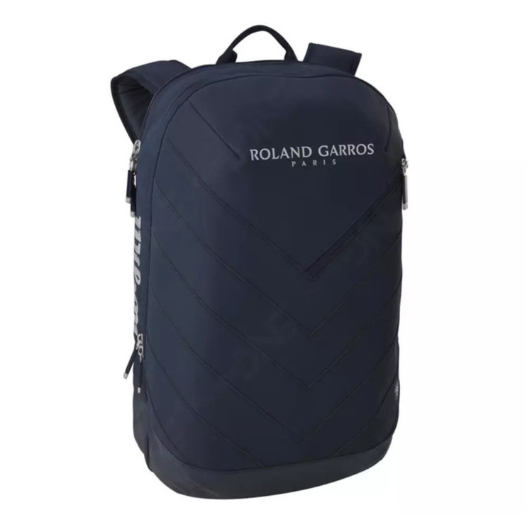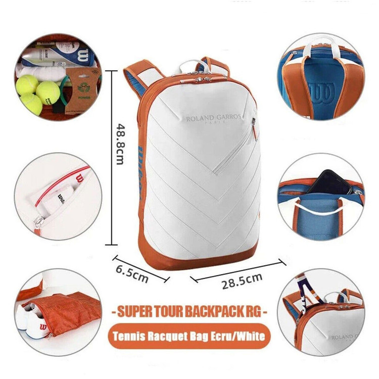 ابعاد: ۴۹×۲۸.۵×۱۶.۵ سانتیمتر باکیفیت و مقاوم دارای یک قسمت مخصوص راکت با ظرفیت دو راکت دارای یک بخش بزرگ برای نگهداری وسایل مختلف دارای دو جیب زیپدار در قسمت جلو و پشت دارای یک کیسه برای نگهداری کفش و البسه کثیف منقش به نشان مسابقات رولان گاروس