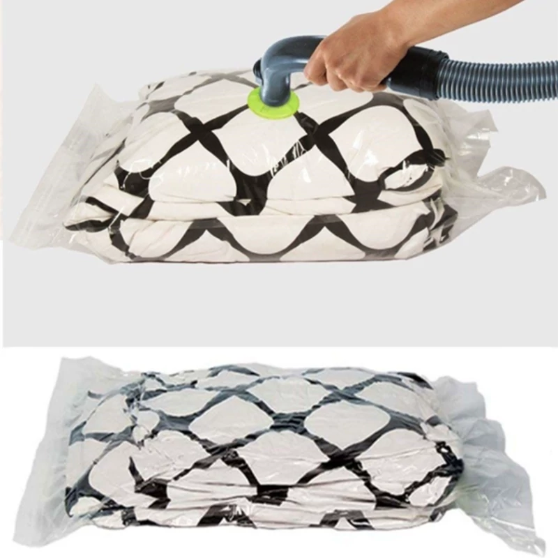 وکیوم پک کیسه مخصوصی است که شما میتوانید با استفاده از آن حجم البسه خود را تا 75 درصد کاهش دهید. یکی از کاربردهای استفاده از کیسه کم حجم کننده لباس یا همان وکیوم بگ جلوگیری از نفوذ حشرات، بید زدگی، رطوبت، بوگرفتگی، گرد و خاک و نفوذ قارچ ها و باکتری ها به داخل البسه است. یا تصور کنید که قصد رفتن به سفر را دارید آیا دوست ندارید حجم لباس هایتان تا یک چهارم کاهش پیدا کند تا راحت تر در چمدان یا ساک شما جای بگیرد؟ کیسه کم حجم کننده لباس (وکیوم بگ) این کار را برای شما انجام می دهد. فقط کافیست از قسمت کناری کیسه پوشاک خود را وارد کیسه کرده و سپس بعد از بستن زیپ مخصوص با جاروبرقی اقدام به تخلیه هوای داخل کیسه نمایید . دقت کنید برای دریافت نتیجه مطلوب از تا کردن زیاد البسه داخل کیسه خودداری نمایید تا هوا بتواند در هنگام مکش به درستی خارج شود همچنین از فشردن زیاد البسه داخل یک کیسه خودداری نمایید. در هنگام تخلیه هوا حتما ابتدا جاروبرقی را خاموش کرده و سپس خرطومی جاروبرقی را از دهانه کیسه جدا کنید تا آسیبی به درب خروجی هوا وارد نشود.