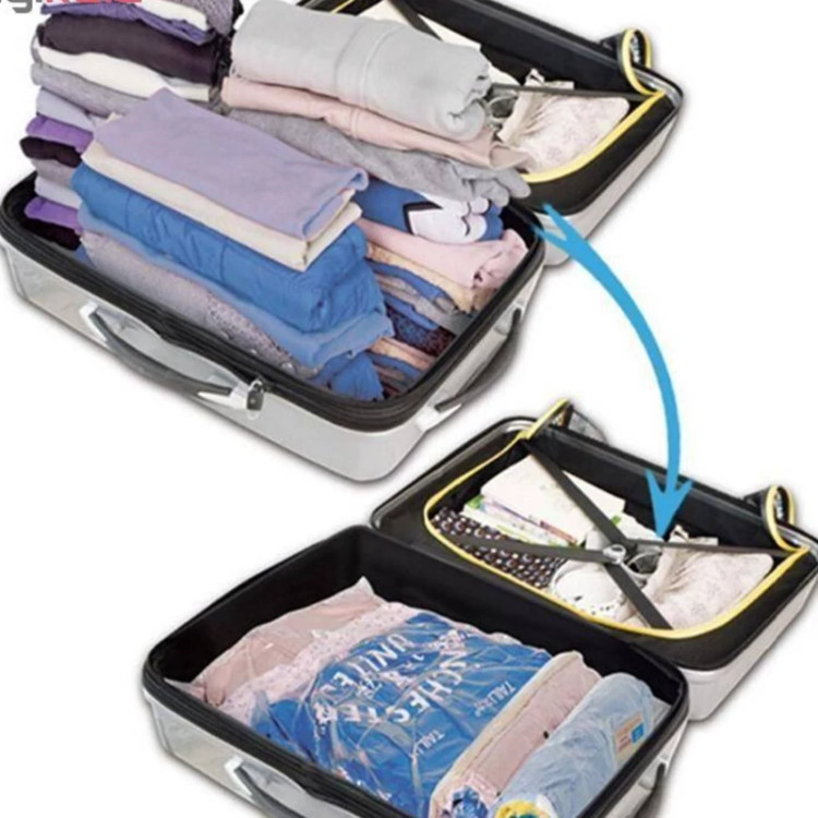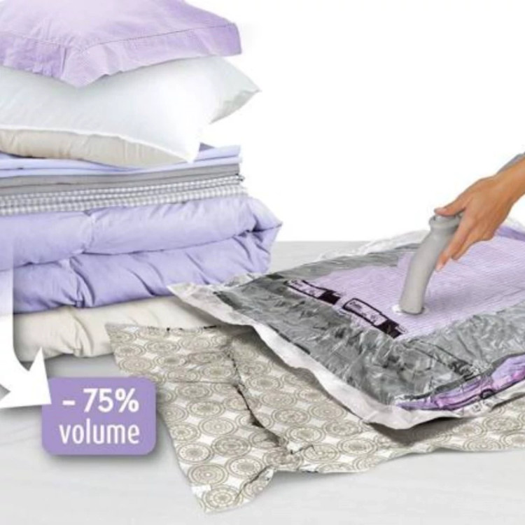 وکیوم پک کیسه مخصوصی است که شما میتوانید با استفاده از آن حجم البسه خود را تا 75 درصد کاهش دهید. یکی از کاربردهای استفاده از کیسه کم حجم کننده لباس یا همان وکیوم بگ جلوگیری از نفوذ حشرات، بید زدگی، رطوبت، بوگرفتگی، گرد و خاک و نفوذ قارچ ها و باکتری ها به داخل البسه است. یا تصور کنید که قصد رفتن به سفر را دارید آیا دوست ندارید حجم لباس هایتان تا یک چهارم کاهش پیدا کند تا راحت تر در چمدان یا ساک شما جای بگیرد؟ کیسه کم حجم کننده لباس (وکیوم بگ) این کار را برای شما انجام می دهد. فقط کافیست از قسمت کناری کیسه پوشاک خود را وارد کیسه کرده و سپس بعد از بستن زیپ مخصوص با جاروبرقی اقدام به تخلیه هوای داخل کیسه نمایید . دقت کنید برای دریافت نتیجه مطلوب از تا کردن زیاد البسه داخل کیسه خودداری نمایید تا هوا بتواند در هنگام مکش به درستی خارج شود همچنین از فشردن زیاد البسه داخل یک کیسه خودداری نمایید. در هنگام تخلیه هوا حتما ابتدا جاروبرقی را خاموش کرده و سپس خرطومی جاروبرقی را از دهانه کیسه جدا کنید تا آسیبی به درب خروجی هوا وارد نشود.