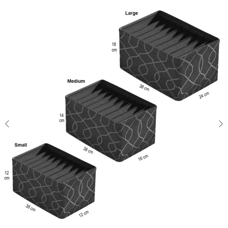 باکس دیواره دار در سه سایز مختلف اسمال دارای 10 خانه در ابعاد 38x12x12 سانتیمتر و سایز مدیوم دارای 9 خانه در ابعاد 38x16x14 سانتیمتر و سایز لارج دارای 8 خانه در ابعاد 38x24x18 سانتیمتر می باشد. اسکلت داخلی این نظم دهنده (مقوا ضخیم فشرده) استحکام و مقاومت آن را افزایش میدهد و در زمانی که نظم دهنده به صورت کامل پر نباشد، همچنان شکل ظاهری آن را به خوبی حفظ میکند.خانههای امروزی به جای بقچه نیاز به منظم کنندههایی دارند که دارای حجم مناسب بوده و خود فضای زیادی اشغال نکنند، تعداد زیادی از وسایل را در خود جای دهند و از وارد شدن فشار به محتوای داخلی خود جلوگیری کنند