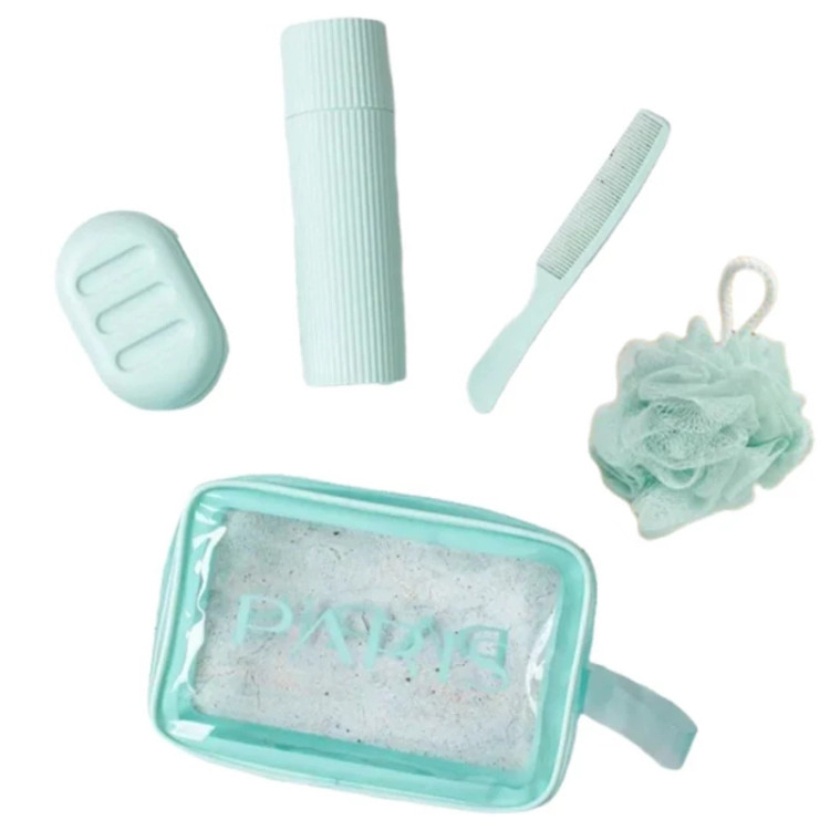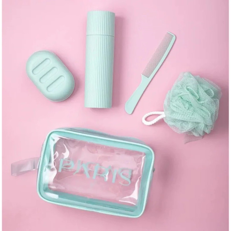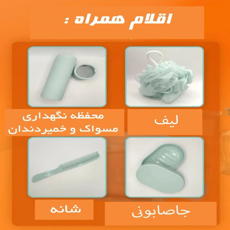 پکینگ مسافرتی بهداشتی حمام دارای یک شانه یک جامسواکی یک لیف ویک جاصابونی که از کیف آن هم به عنوان کیف لوازم آرایشی نیز میتوان استفاده کرد