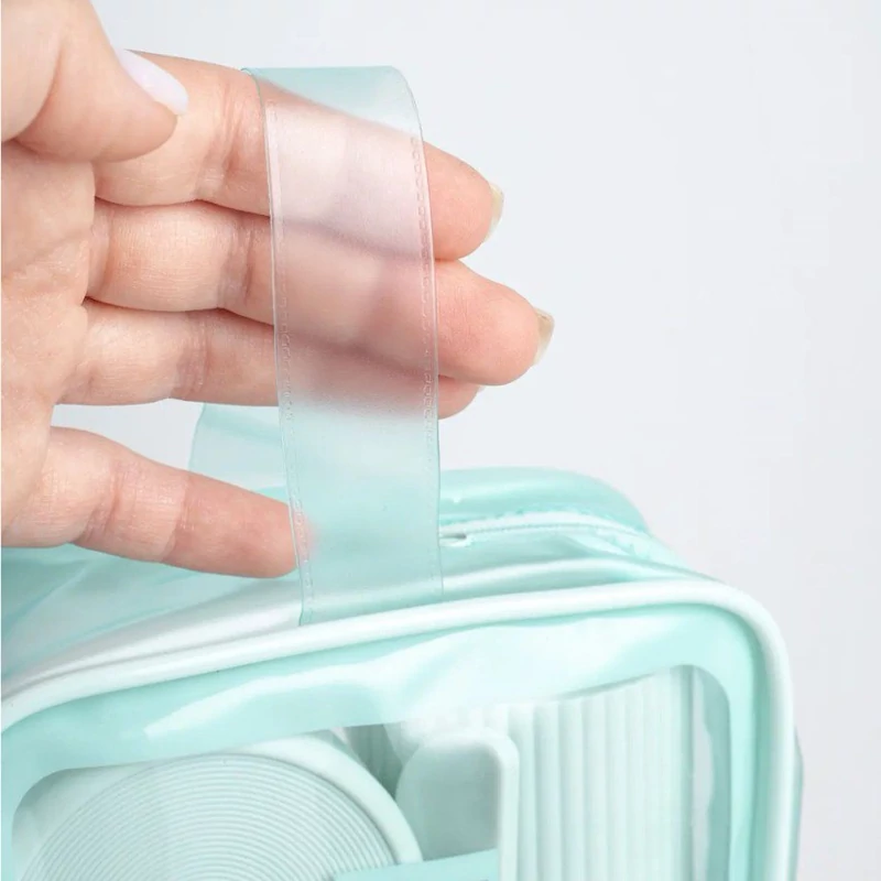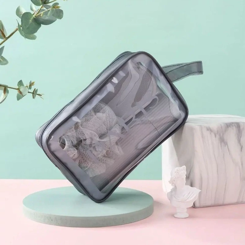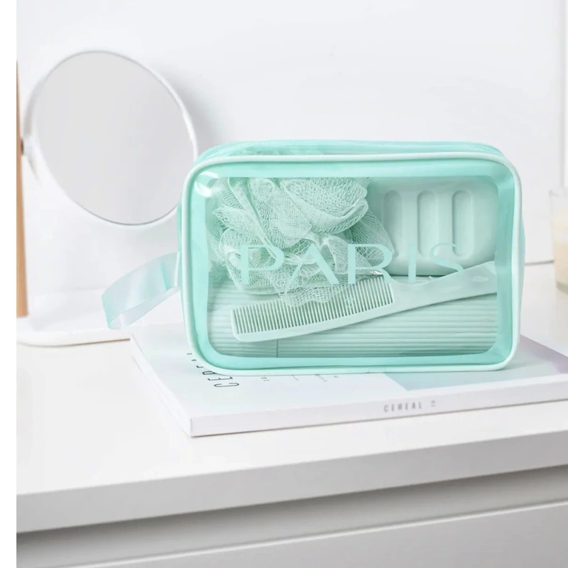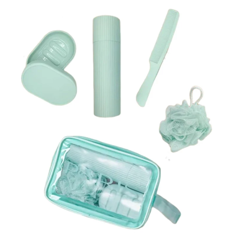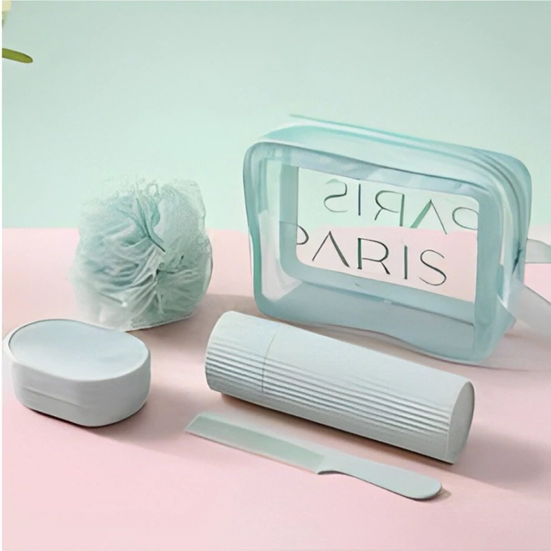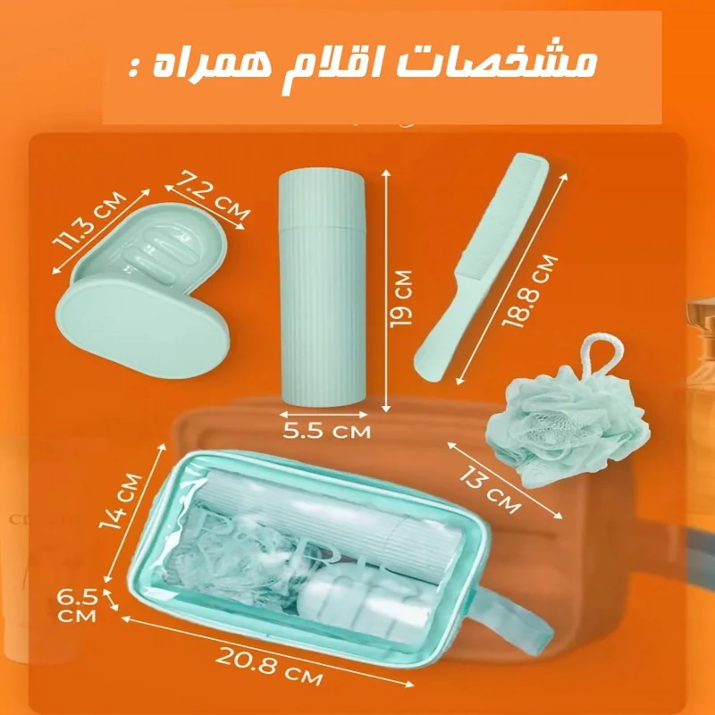 پکینگ مسافرتی بهداشتی حمام دارای یک شانه یک جامسواکی یک لیف ویک جاصابونی که از کیف آن هم به عنوان کیف لوازم آرایشی نیز میتوان استفاده کرد