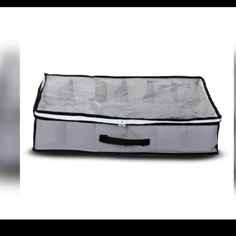 این محصول فاقد دیواره ی مقوایی و محکم میباشد و تمام متریال بدنه ی آن پارچه و درب آن طلق شفاف است. دارای 12خانه که در هر خانه یک جفت کفش جا میگیرد و همچنین دارای دسته میباشد برای حمل آسان و راحت
