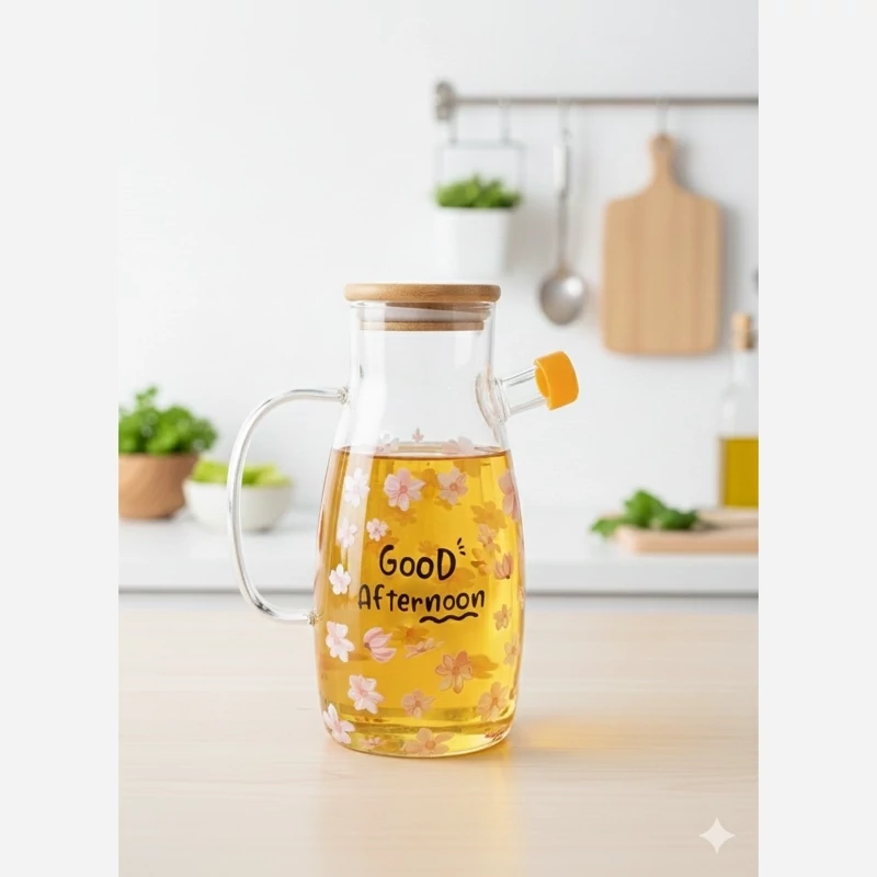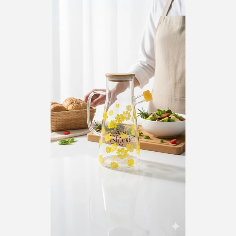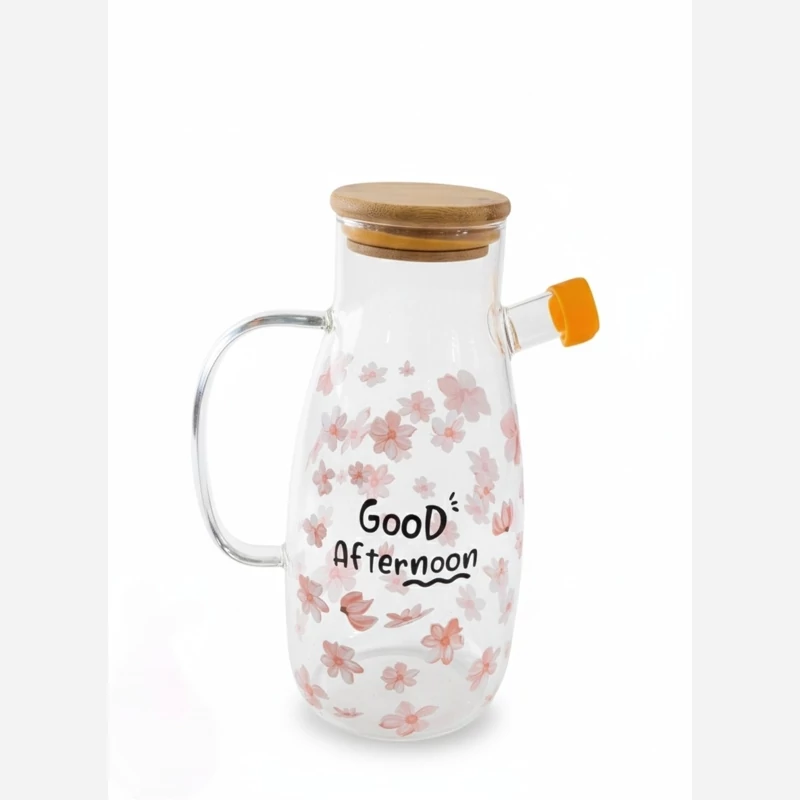 جنس بدنه: پیرکس شفاف و ضخیم | حجم: 1000 میلیلیتر | جنس درب: بامبو + واشر سیلیکونی | طراحی: تپل با طرح بابونه